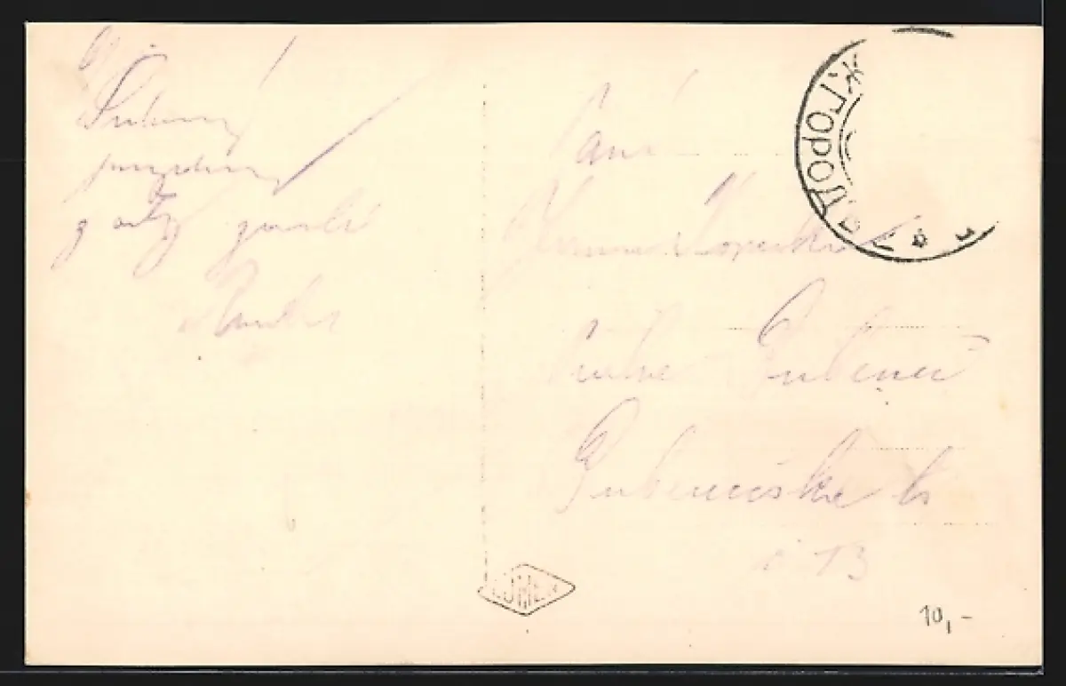 Personenbezogene Daten auf der Rückseite der Karte wurden durch blauen Textmarker unkenntlich gemacht. Die blauen Stellen sind auf die Vorderseite durchgeweicht und wirken sich negativ auf das Postkartenfoto aus
