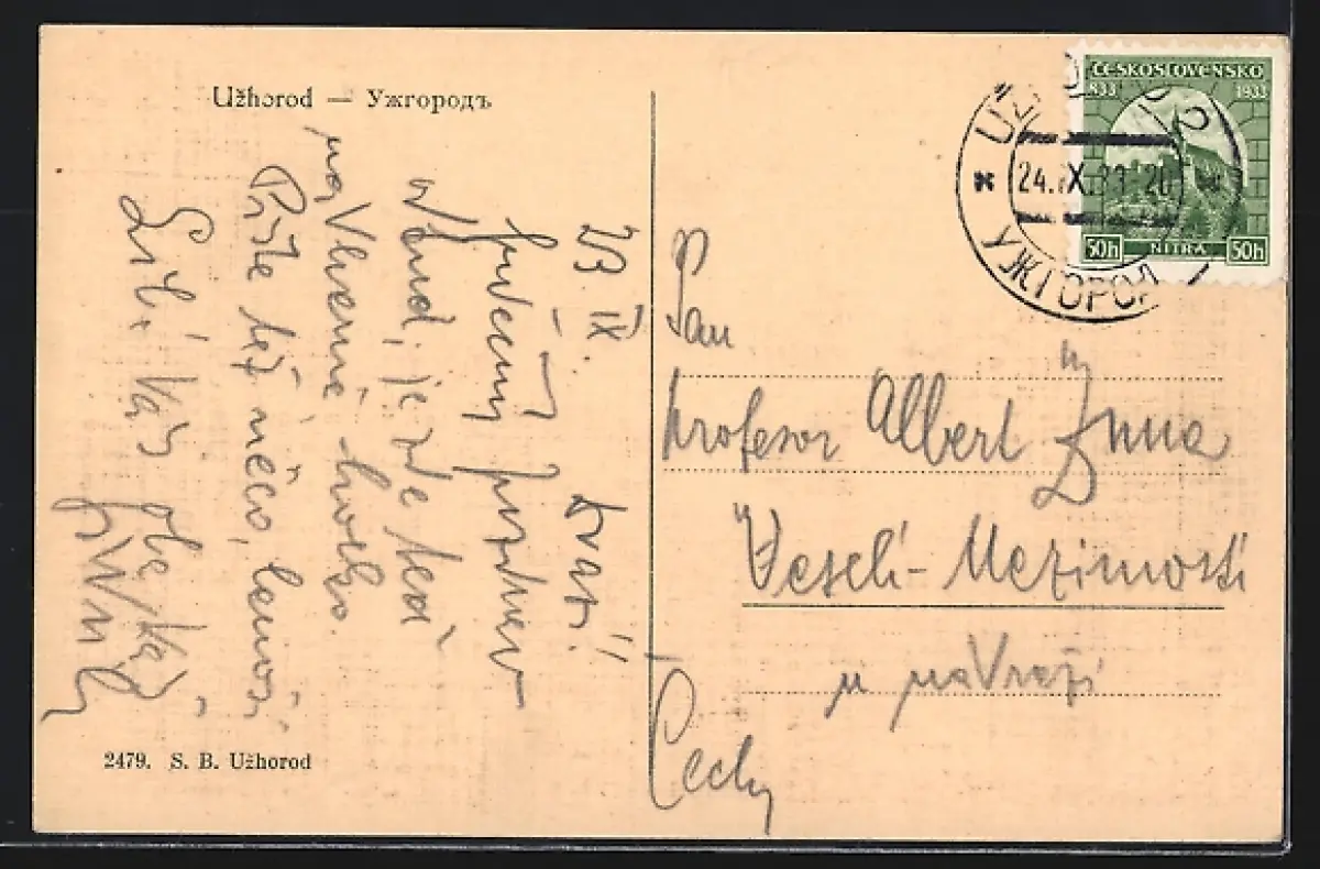 Personenbezogene Daten auf der Rückseite der Karte wurden durch blauen Textmarker unkenntlich gemacht. Die blauen Stellen sind auf die Vorderseite durchgeweicht und wirken sich negativ auf das Postkartenfoto aus