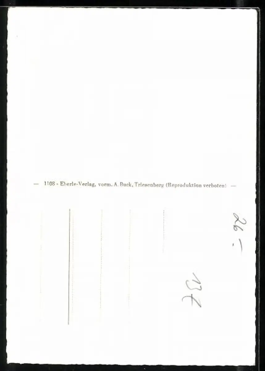 Personenbezogene Daten auf der Rückseite der Karte wurden durch blauen Textmarker unkenntlich gemacht. Die blauen Stellen sind auf die Vorderseite durchgeweicht und wirken sich negativ auf das Postkartenfoto aus