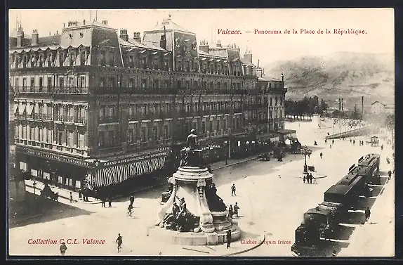 AK Valence, Panorama de la Place de la République avec statue et bâtiments historiques