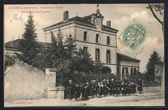AK Valence-d`Agen, École laïque des Garcons et élèves devant l`entrée
