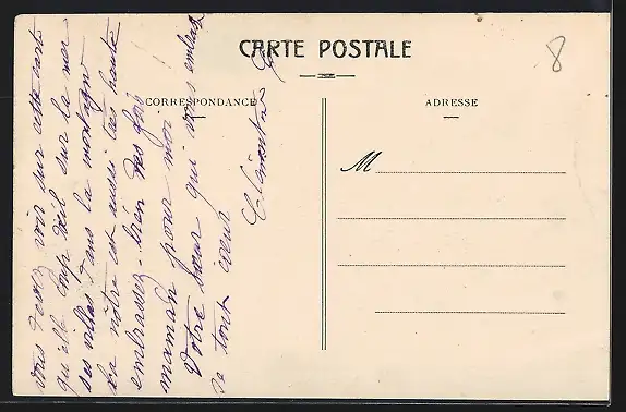 Personenbezogene Daten auf der Rückseite der Karte wurden durch blauen Textmarker unkenntlich gemacht. Die blauen Stellen sind auf die Vorderseite durchgeweicht und wirken sich negativ auf das Postkartenfoto aus
