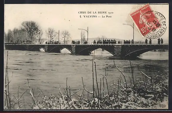 AK Valvins, Crue de la Seine 1910, Le Pont avec spectateurs