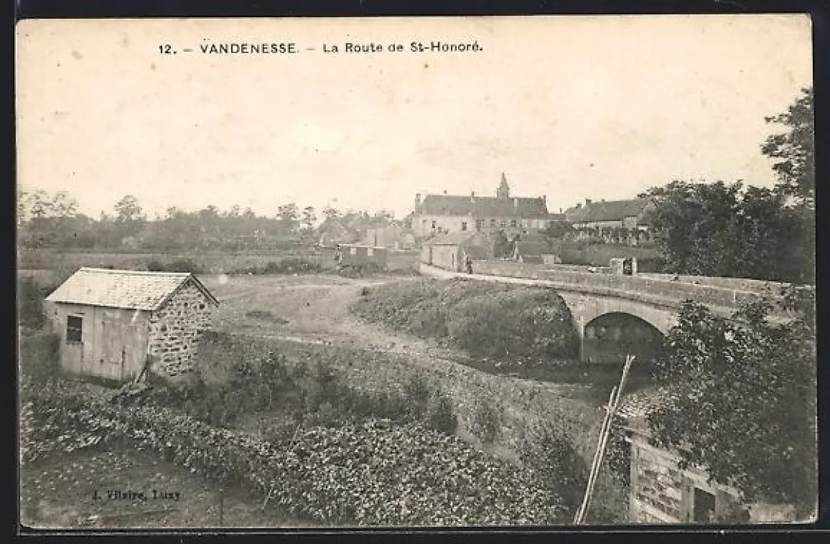 AK Vandenesse, La Route de St-Honoré avec pont et paysage rural