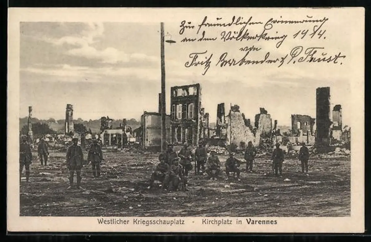 AK Varennes, Place de l`église sur le front occidental avec soldats et ruines
