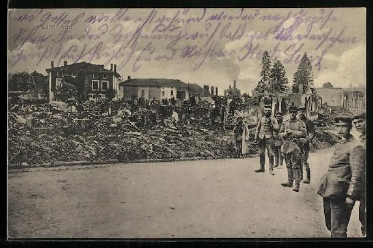 AK Varennes, Soldats devant des bâtiments en ruines après un bombardement