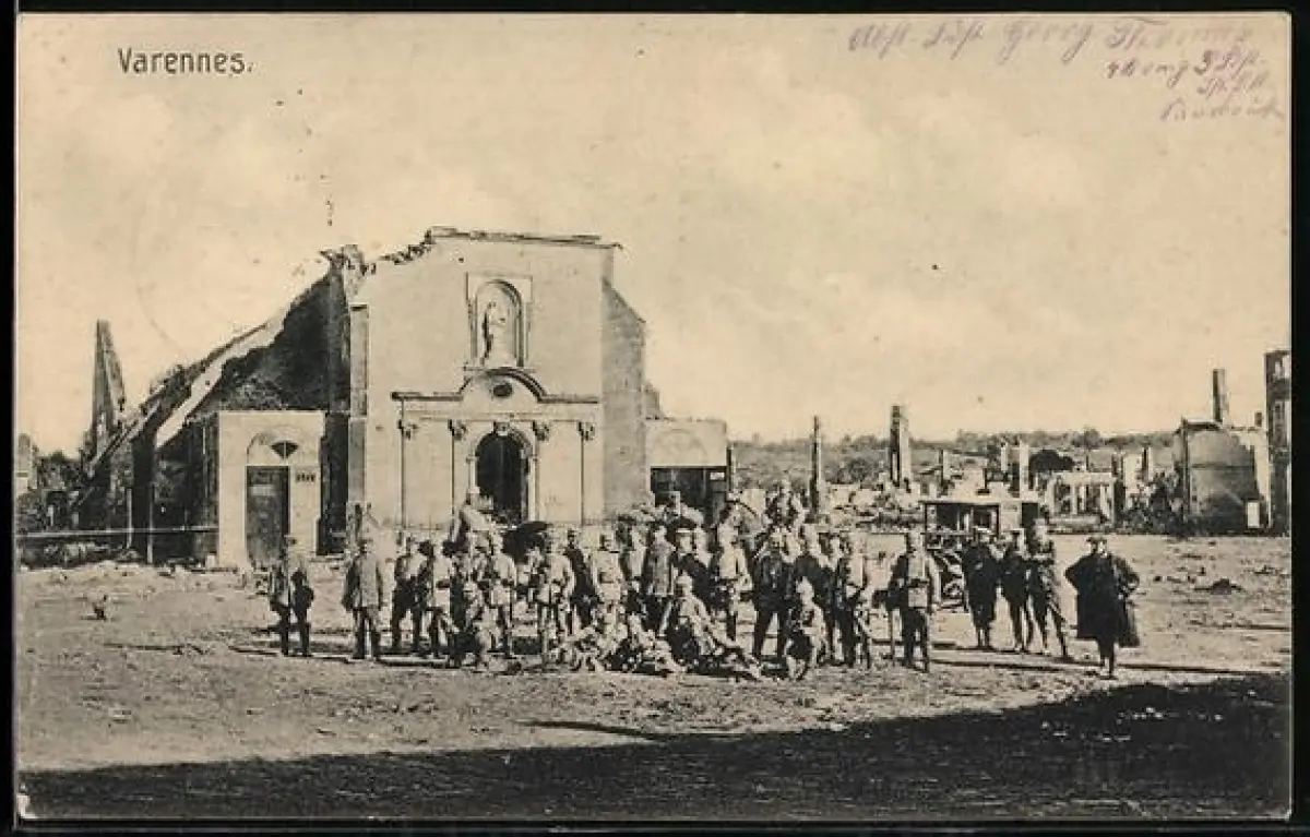 AK Varennes, Soldats devant une église en ruines après un bombardement