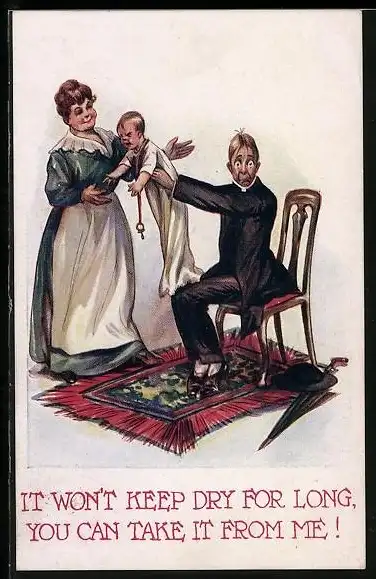 AK Vater hält Mutter das Kind hin, Scherz