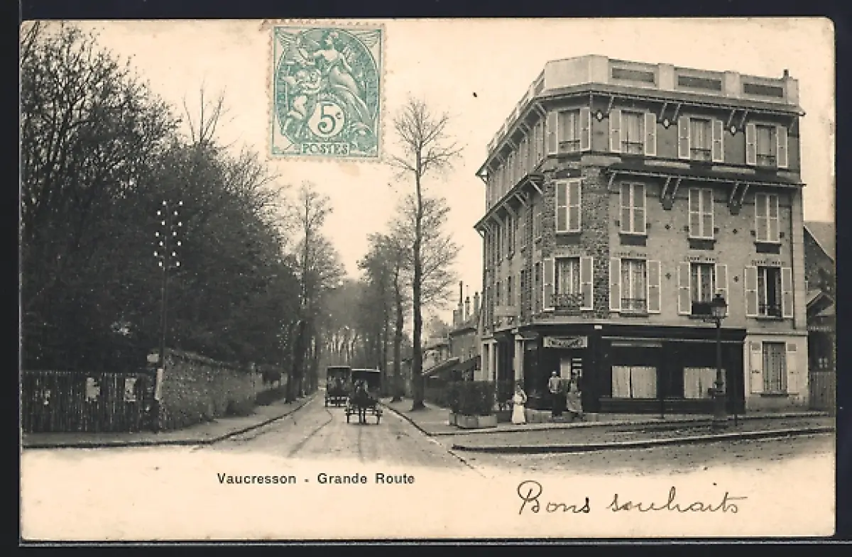 AK Vaucresson, Grande Route avec calèche et bâtiment d`angle