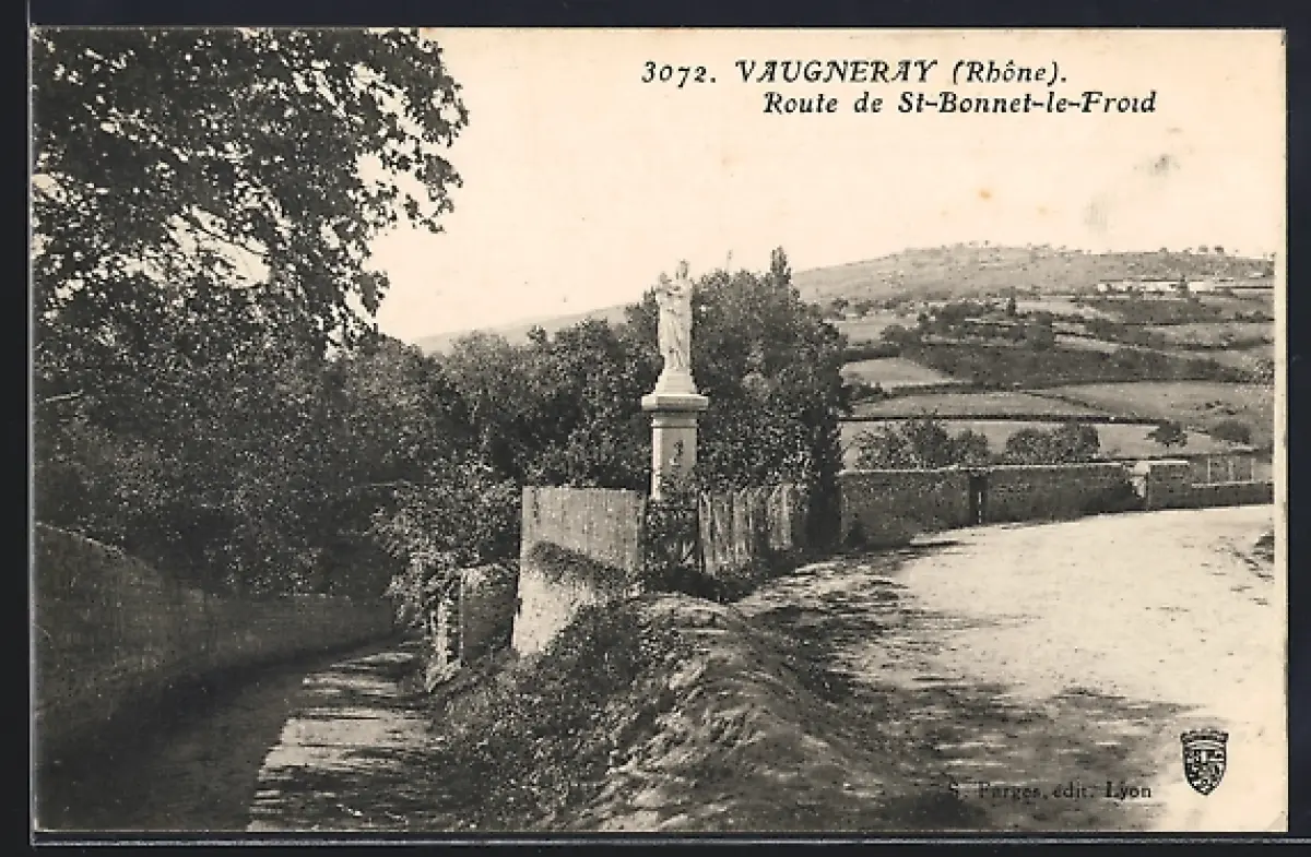 AK Vaugneray /Rhône, Route de St-Bonnet-le-Froid avec statue et paysage vallonné