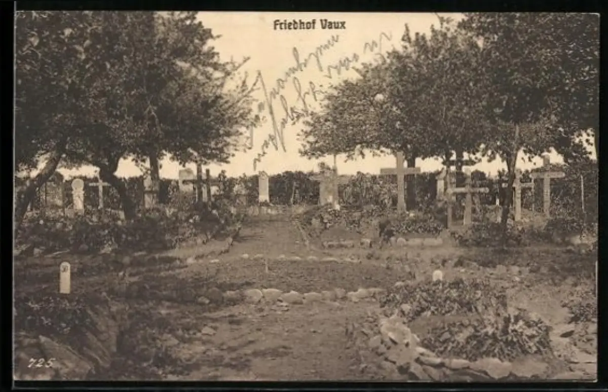 AK Vaux, Cimetière entouré d`arbres et de croix