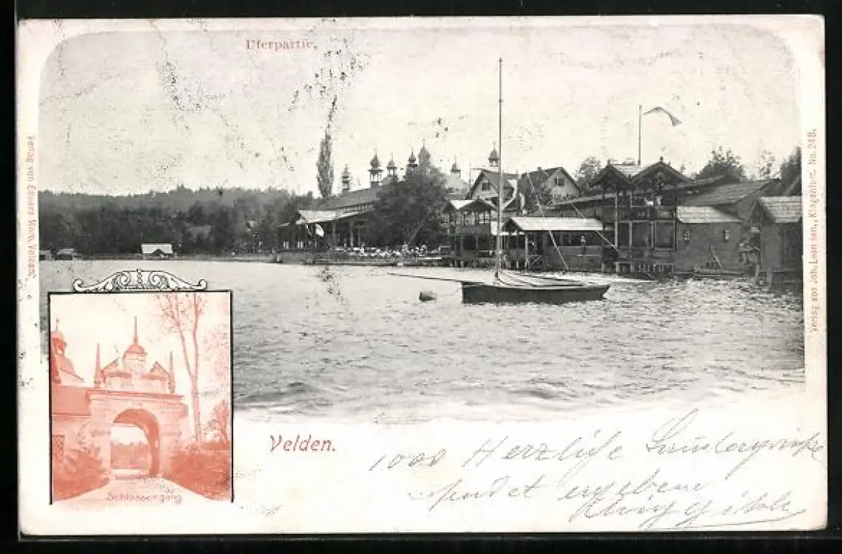 AK Velden, Uferpartie mit Segelboot und Schlosseingang