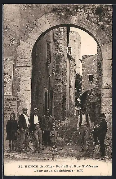 AK Vence, Portail et Rue St-Véran avec Tour de la Cathédrale et habitants devant l`arche
