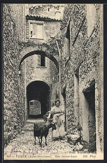 AK Vence, Rue Sainte-Luce avec femme et chèvre dans une ruelle pittoresque