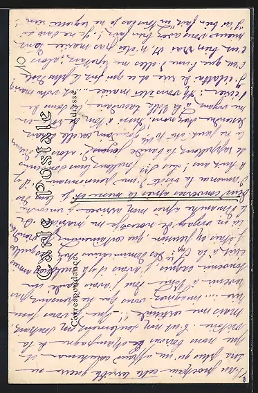 Personenbezogene Daten auf der Rückseite der Karte wurden durch blauen Textmarker unkenntlich gemacht. Die blauen Stellen sind auf die Vorderseite durchgeweicht und wirken sich negativ auf das Postkartenfoto aus
