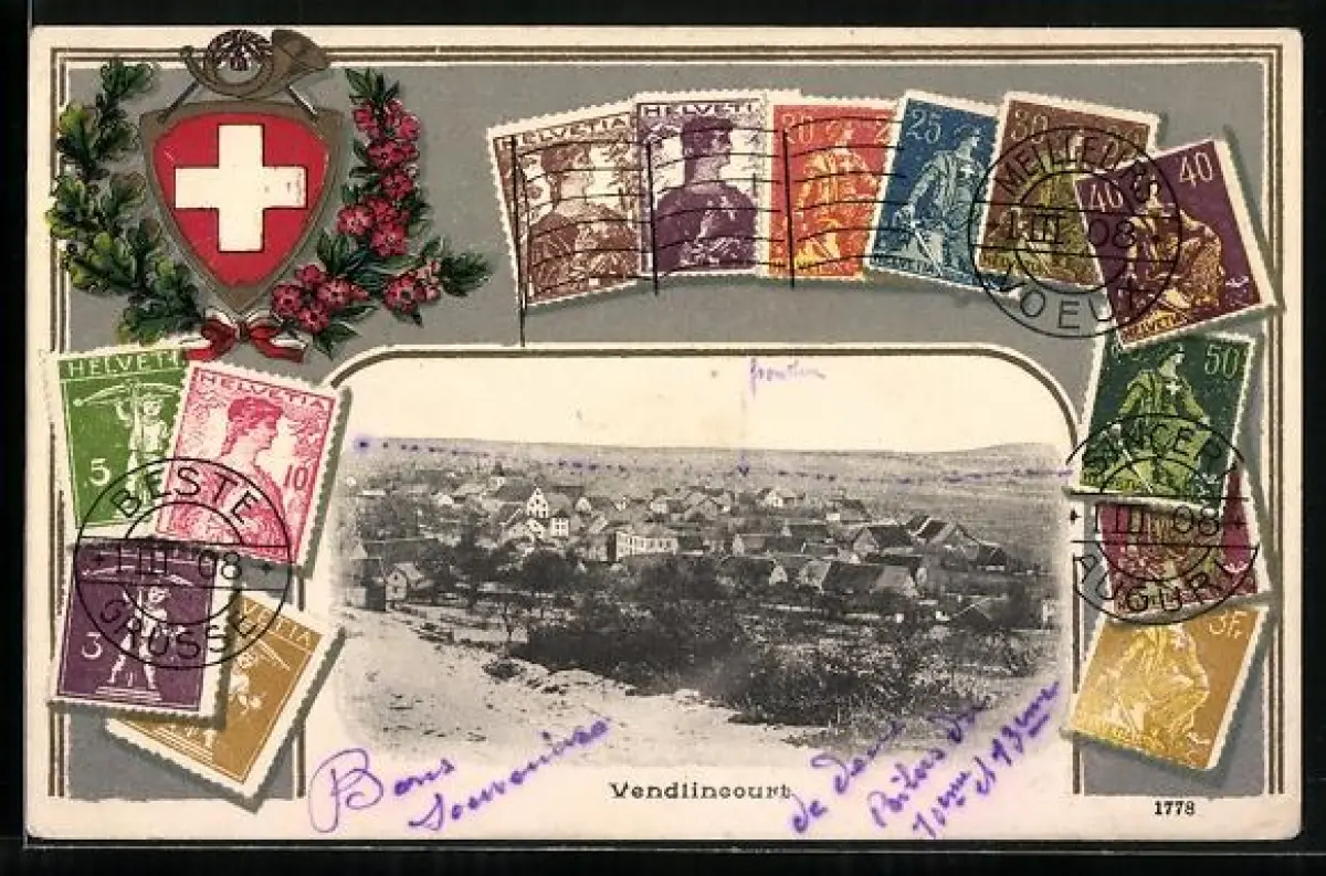 AK Vendlincourt, Ortsansicht aus der Vogelschau, verschiedene Schweizer Briefmarken