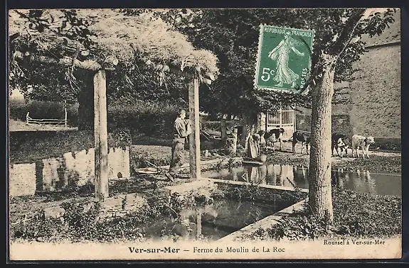 AK Ver-sur-Mer, Ferme du Moulin de La Roc et scène rurale avec animaux