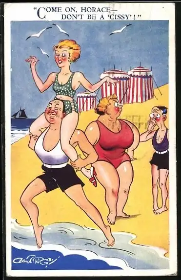 AK Verärgerte Ehefrau mit wasserscheuem Mann neben jungem Paar am Meer