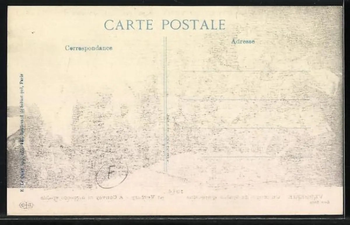 Personenbezogene Daten auf der Rückseite der Karte wurden durch blauen Textmarker unkenntlich gemacht. Die blauen Stellen sind auf die Vorderseite durchgeweicht und wirken sich negativ auf das Postkartenfoto aus