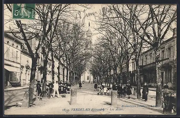 AK Verdelais, Les Allées animées par des passants et une vue sur l`église