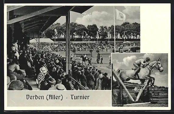 AK Verden / Aller, Pferde-Turnier, Tribüne, Reiter beim Sprung