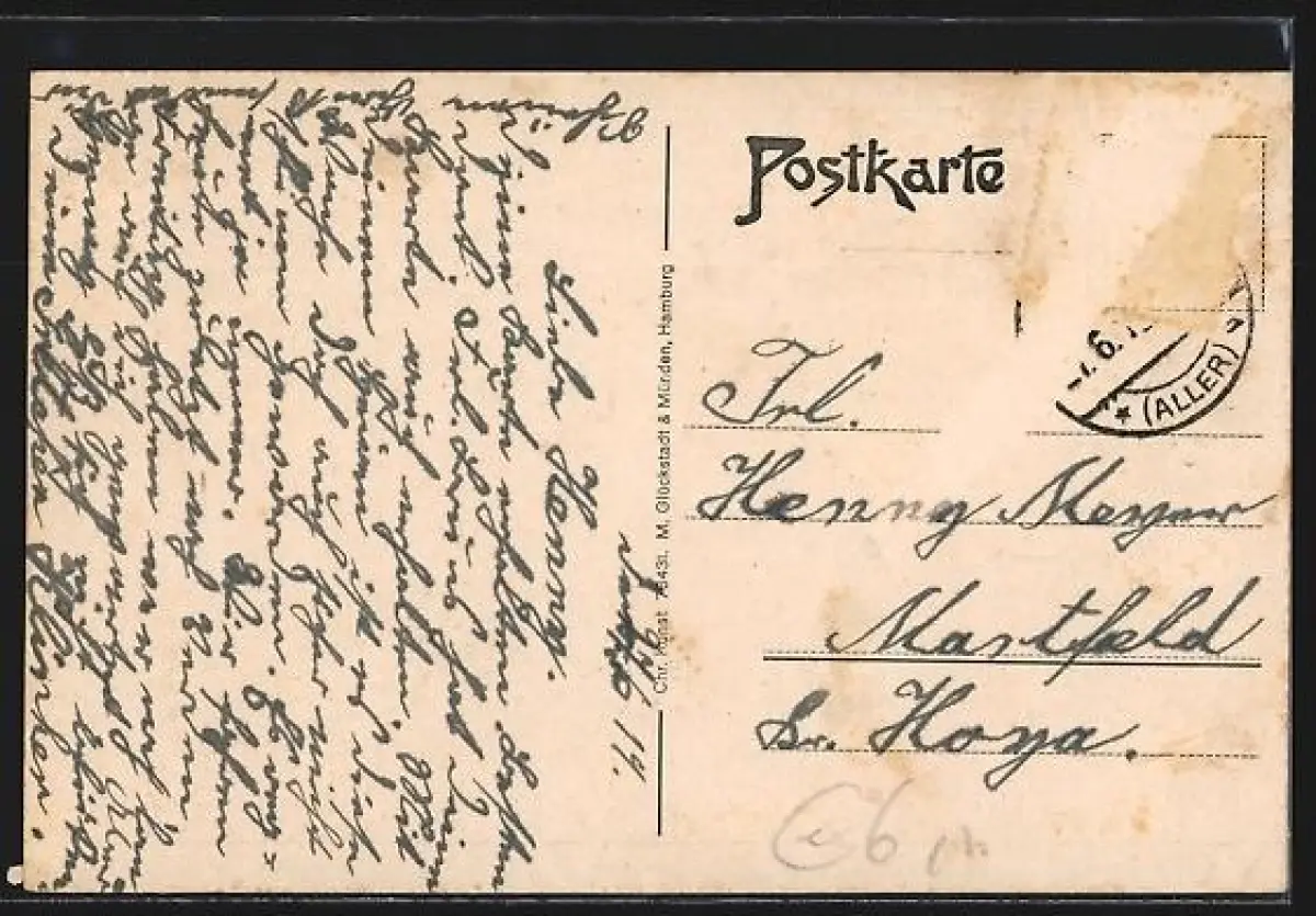 alte Ansichtskarte, gelaufen, Briefmarke entfernt, rückseitig Oberflächenschaden, guter Zustand