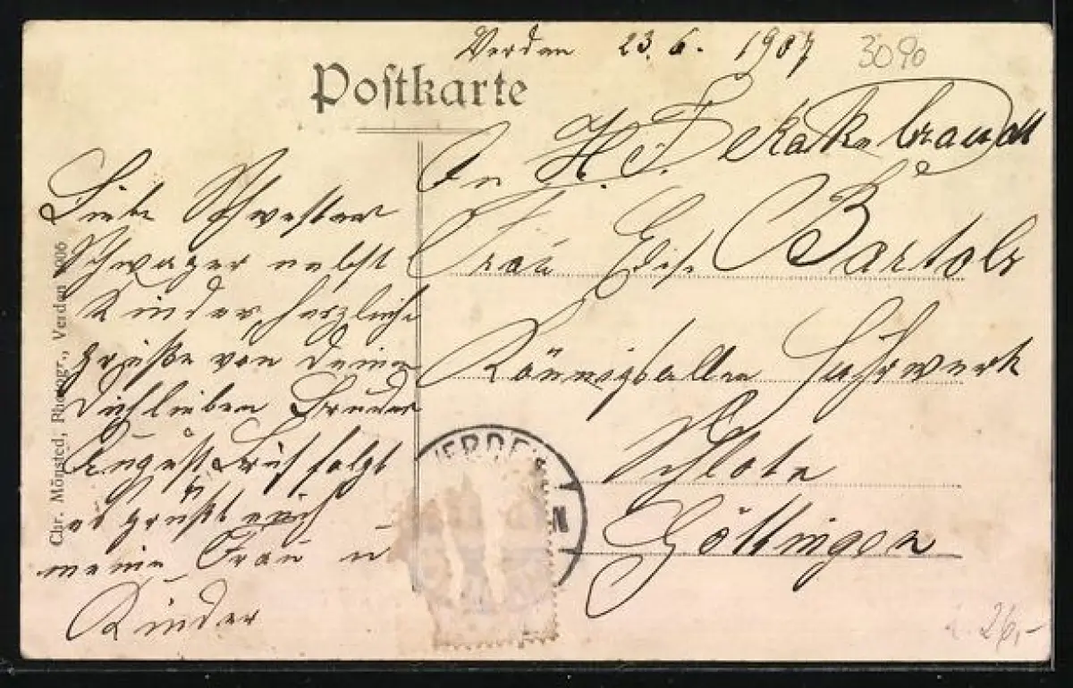 alte Ansichtskarte, gelaufen 1907, Briefmarke entfernt, guter Zustand