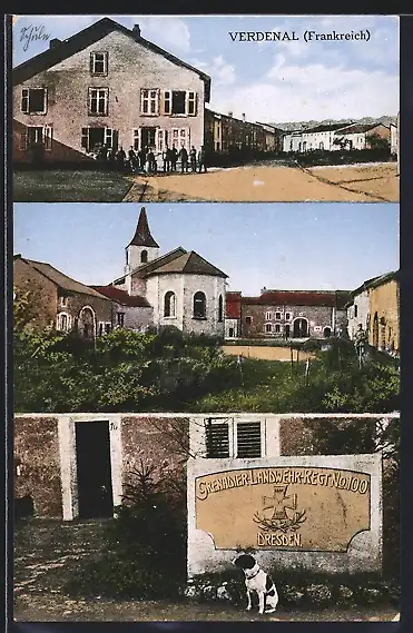 AK Verdenal, Grenadier-Landwehr-Reggt. No. 100 Dresden mit Hund, Kirche mit Häusern