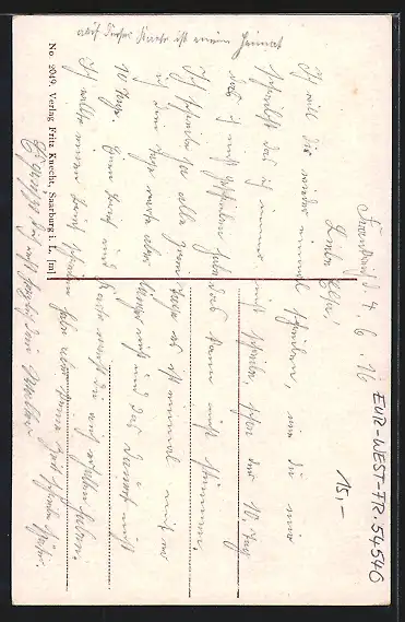 Personenbezogene Daten auf der Rückseite der Karte wurden durch blauen Textmarker unkenntlich gemacht. Die blauen Stellen sind auf die Vorderseite durchgeweicht und wirken sich negativ auf das Postkartenfoto aus