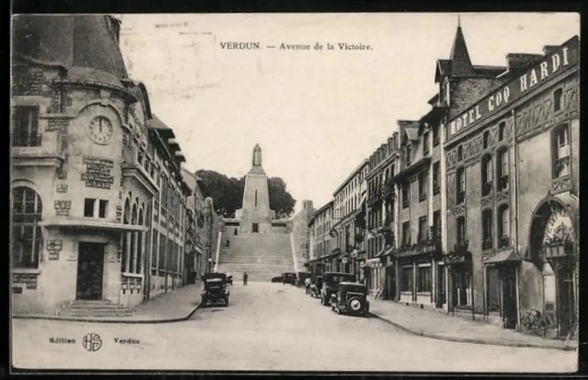 AK Verdun, Avenue de la Victoire avec scène urbaine et voitures anciennes