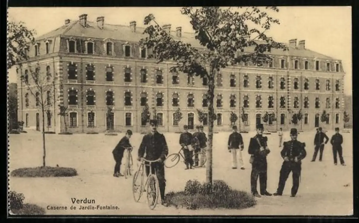 AK Verdun, Caserne de Jardin-Fontaine avec des soldats et un cycliste devant le bâtiment