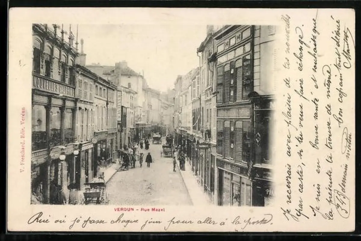 AK Verdun, Rue Mazel animée avec passants et boutiques