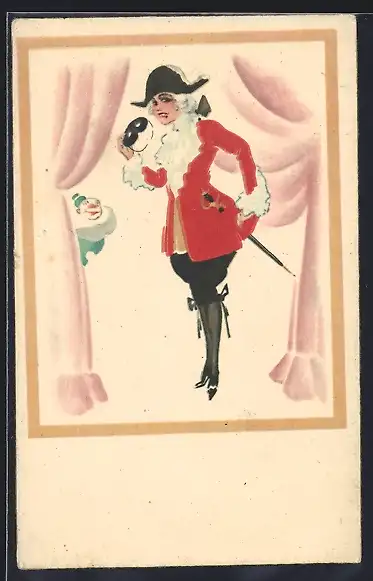 AK Verkleidete Frau steht mit Maske in der Hand vor einem Vorhang, hinter dem ein Clown hervorlugt, Fasching