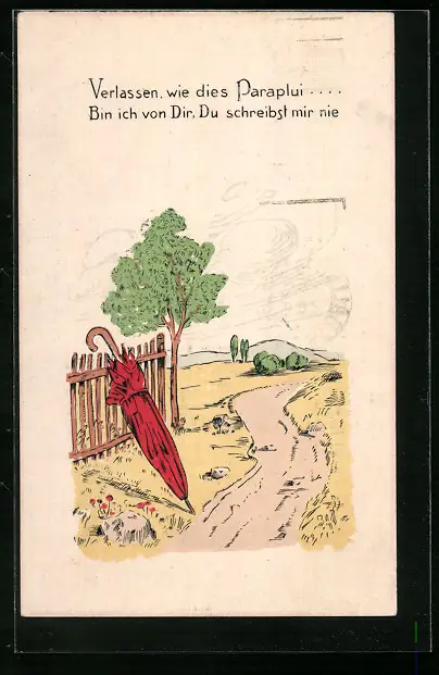 AK Verlassener Regenschirm am Wegesrand mit Aufforderung zum Schreiben