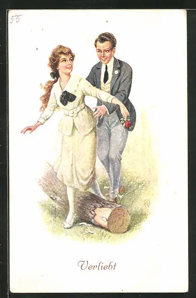 AK Verliebt, Herr steigt mit einer Dame über Baumstamm