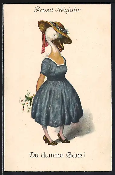 AK Vermenschlichte Gans in Kleid und Hut, Prosit Neujahr