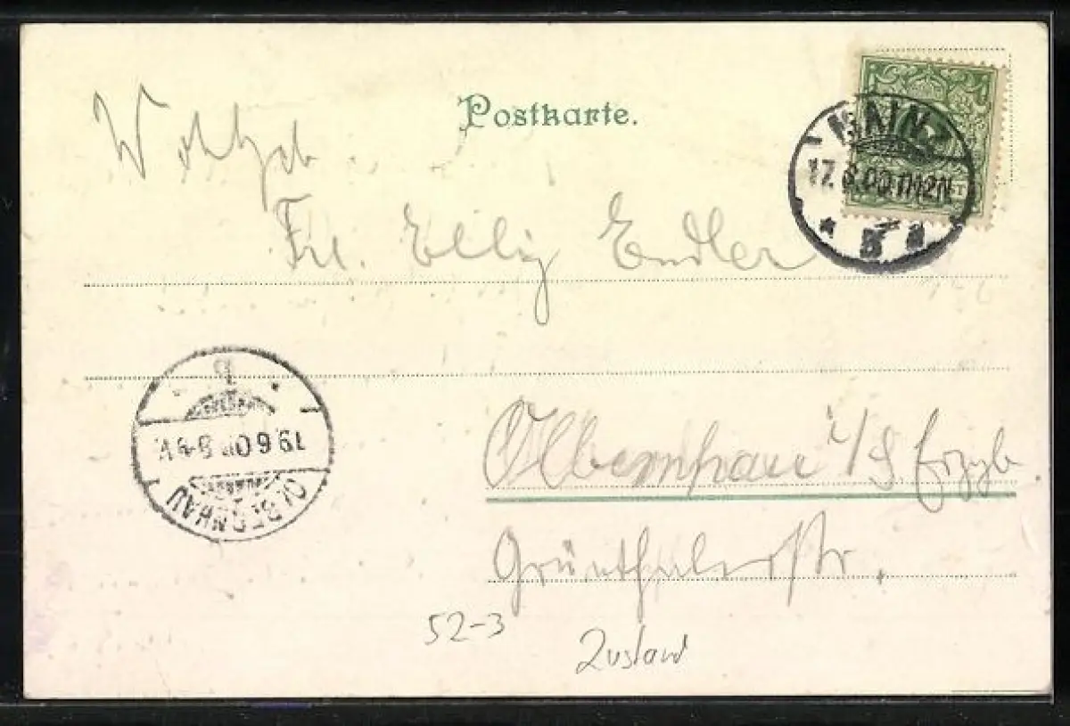 alte Ansichtskarte, gelaufen 1900, Bugspur rechte Kante, Einriss rechte Kante