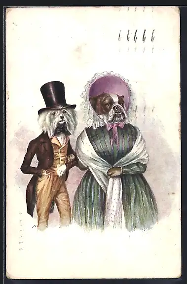 AK Vermenschlichte Hunde in Kleid und Anzug