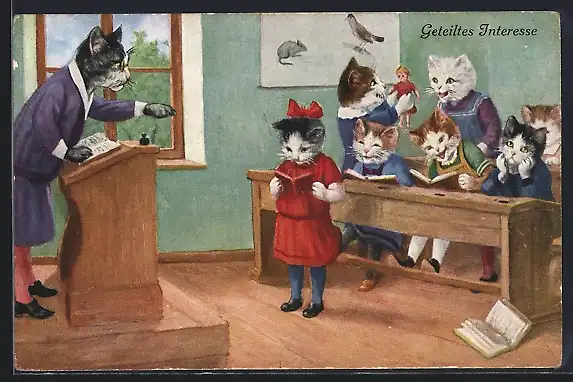 AK Vermenschlichte Tiere, Katzen-Lehrerin mit einer Schülerin beim Vortrag, Geteiltes Interesse