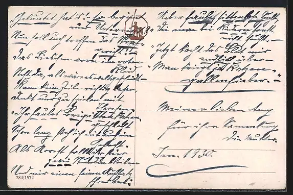 Personenbezogene Daten auf der Rückseite der Karte wurden durch blauen Textmarker unkenntlich gemacht. Die blauen Stellen sind auf die Vorderseite durchgeweicht und wirken sich negativ auf das Postkartenfoto aus