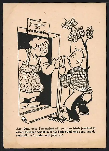 AK Vermieterin meint zu Mann, da Gast ein frisches Ei will, soll er im Garten gackern, während sie Ei im HO-Laden holt