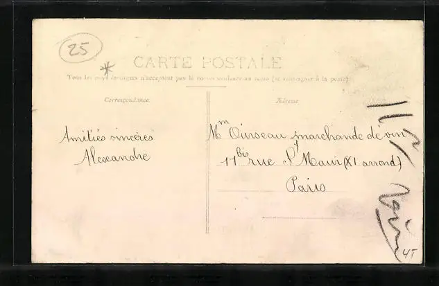 Personenbezogene Daten auf der Rückseite der Karte wurden durch blauen Textmarker unkenntlich gemacht. Die blauen Stellen sind auf die Vorderseite durchgeweicht und wirken sich negativ auf das Postkartenfoto aus