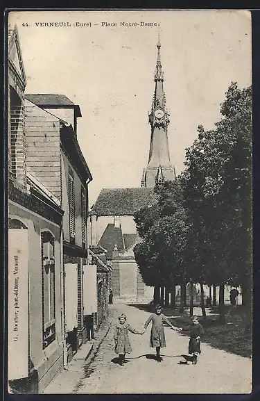 AK Verneuil, Place Notre-Dame avec enfants jouant devant l`église