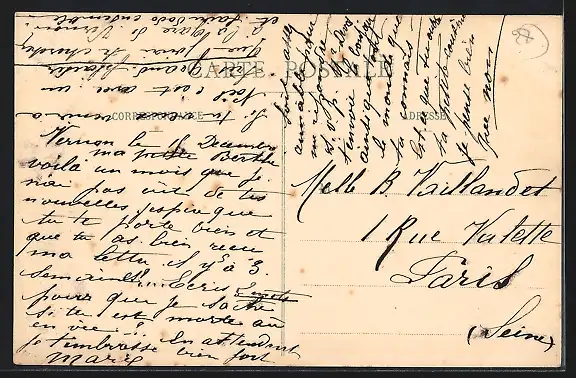 Personenbezogene Daten auf der Rückseite der Karte wurden durch blauen Textmarker unkenntlich gemacht. Die blauen Stellen sind auf die Vorderseite durchgeweicht und wirken sich negativ auf das Postkartenfoto aus