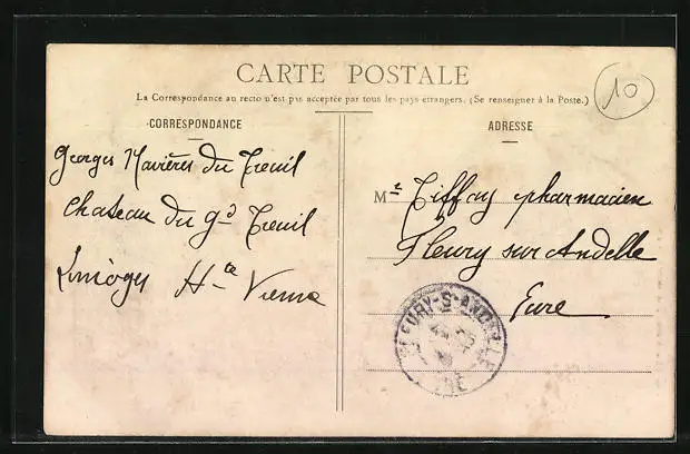 Personenbezogene Daten auf der Rückseite der Karte wurden durch blauen Textmarker unkenntlich gemacht. Die blauen Stellen sind auf die Vorderseite durchgeweicht und wirken sich negativ auf das Postkartenfoto aus