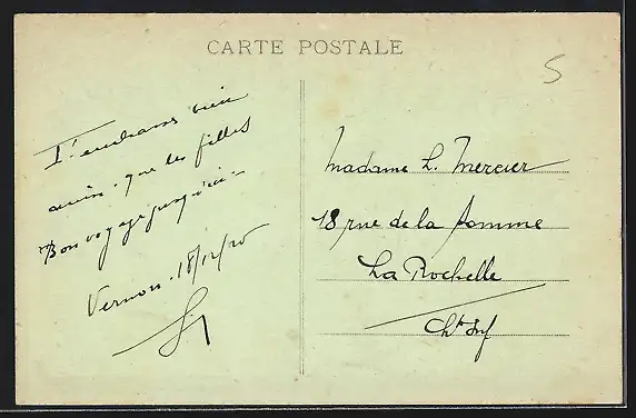 Personenbezogene Daten auf der Rückseite der Karte wurden durch blauen Textmarker unkenntlich gemacht. Die blauen Stellen sind auf die Vorderseite durchgeweicht und wirken sich negativ auf das Postkartenfoto aus