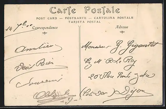 Personenbezogene Daten auf der Rückseite der Karte wurden durch blauen Textmarker unkenntlich gemacht. Die blauen Stellen sind auf die Vorderseite durchgeweicht und wirken sich negativ auf das Postkartenfoto aus