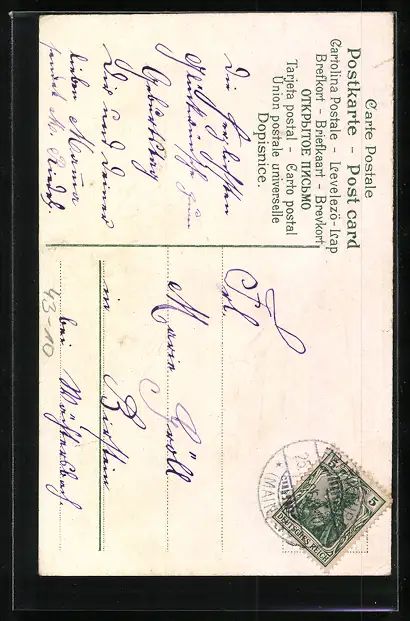 Personenbezogene Daten auf der Rückseite der Karte wurden durch blauen Textmarker unkenntlich gemacht. Die blauen Stellen sind auf die Vorderseite durchgeweicht und wirken sich negativ auf das Postkartenfoto aus