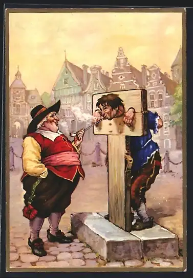 AK Verurteilter am Pranger raucht Tabak durch eine Pfeife