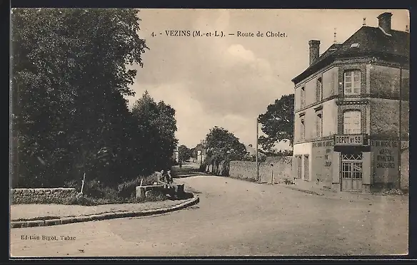 AK Vezins, Route de Cholet avec bâtiment et arbres en bordure de route
